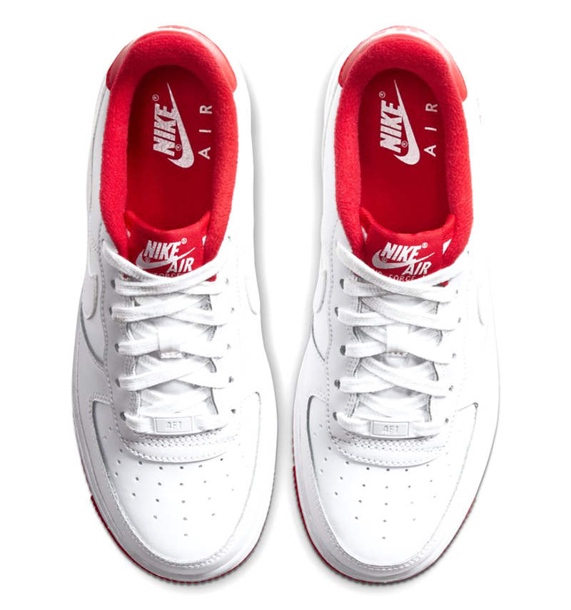 Product Description. The Nike Air Force 1 Low White University Red colorway is inspired by the Air Force 1 design. The Low White University Red Nike Air Force 1 features a white leather upper and red accent. The insole of the shoe is made of soft foam, providing cushioning and comfort for the feet. The tongue features a mesh construction and.