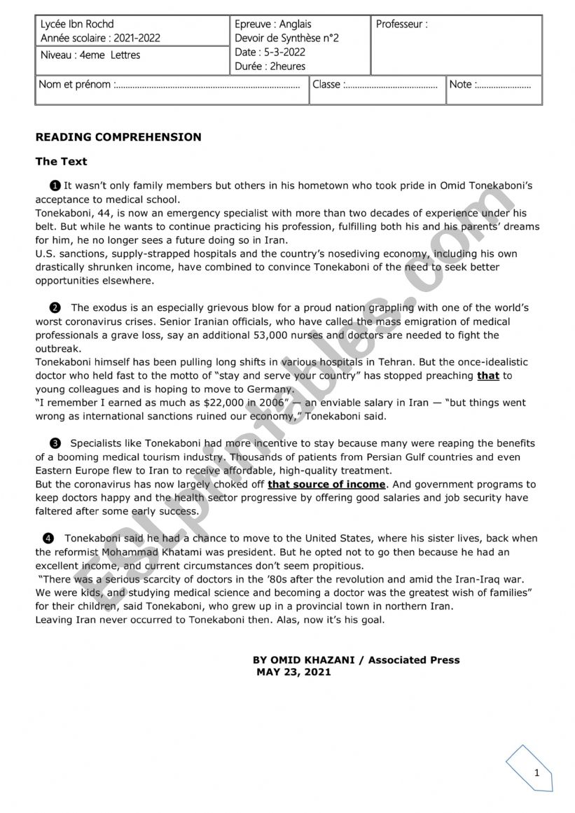 End term test N°1 (4th form sc) English ESL worksheets pdf & doc