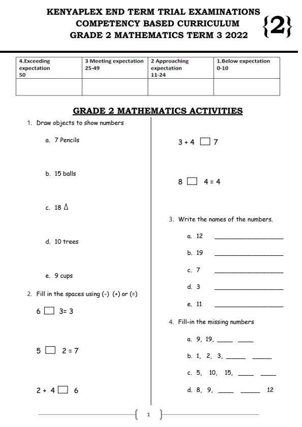 Grade 2 Mathematics Activities End of Term 3 Examination 2022 1111