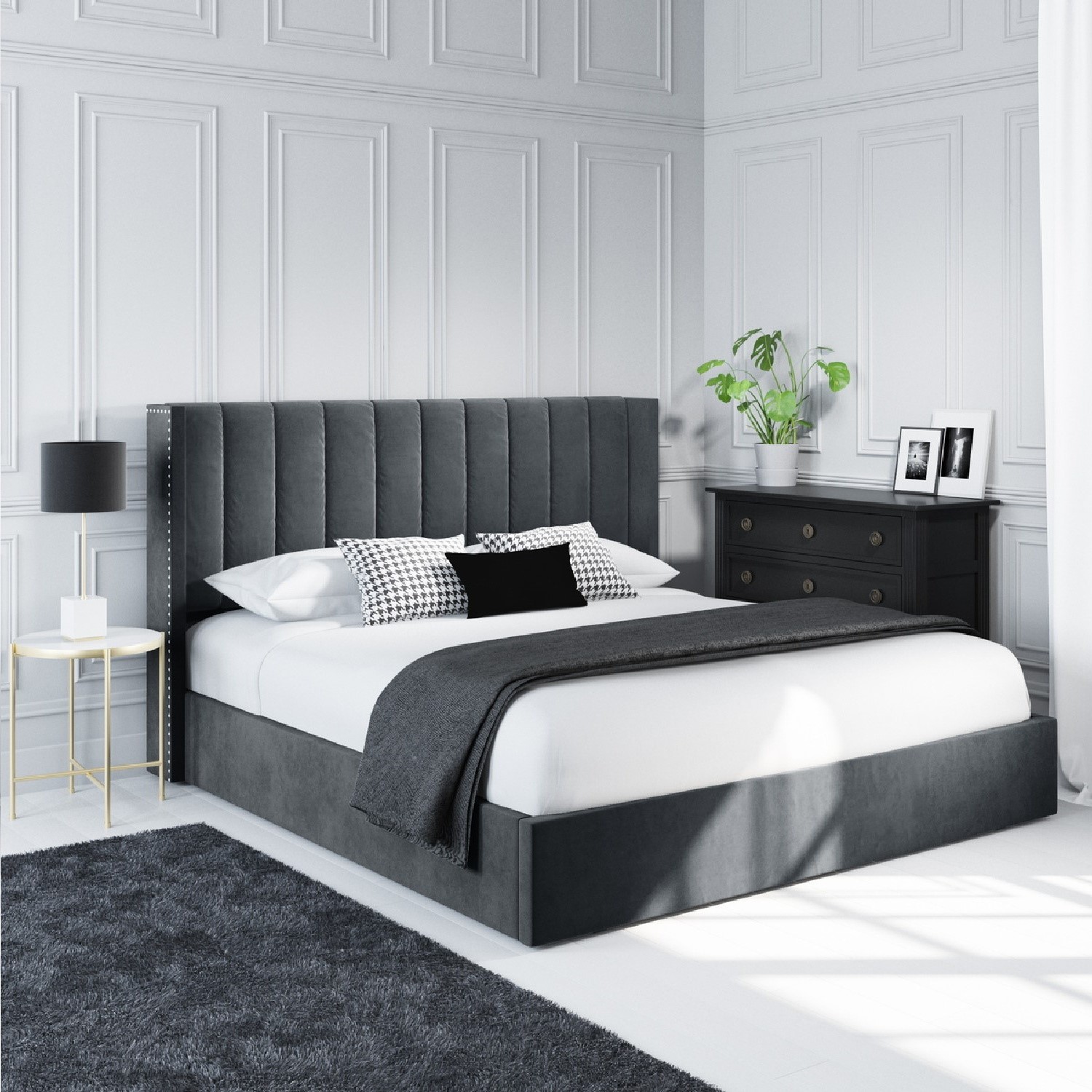 Safina Dark Grey Velvet Super King Ottoman Bed with Winged Headboard Furniture123