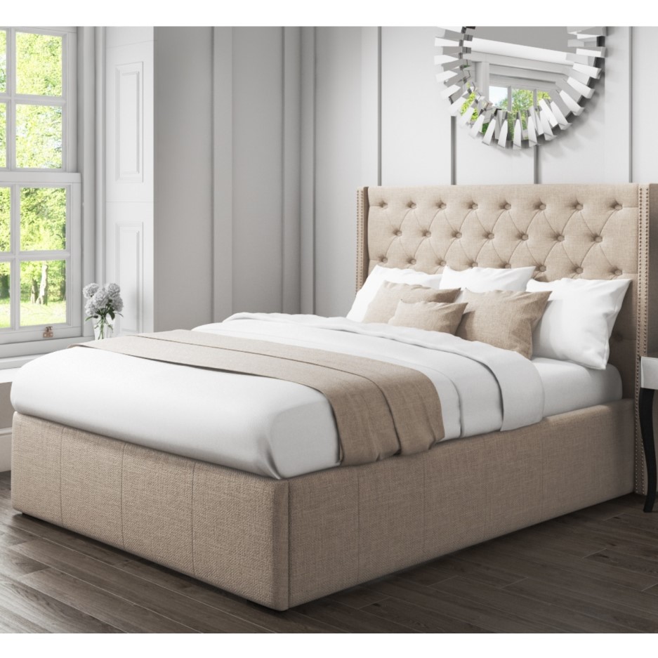 Safina King Size Wing Back Ottoman Bed with Stud Detailing in Woven Beige Furniture123