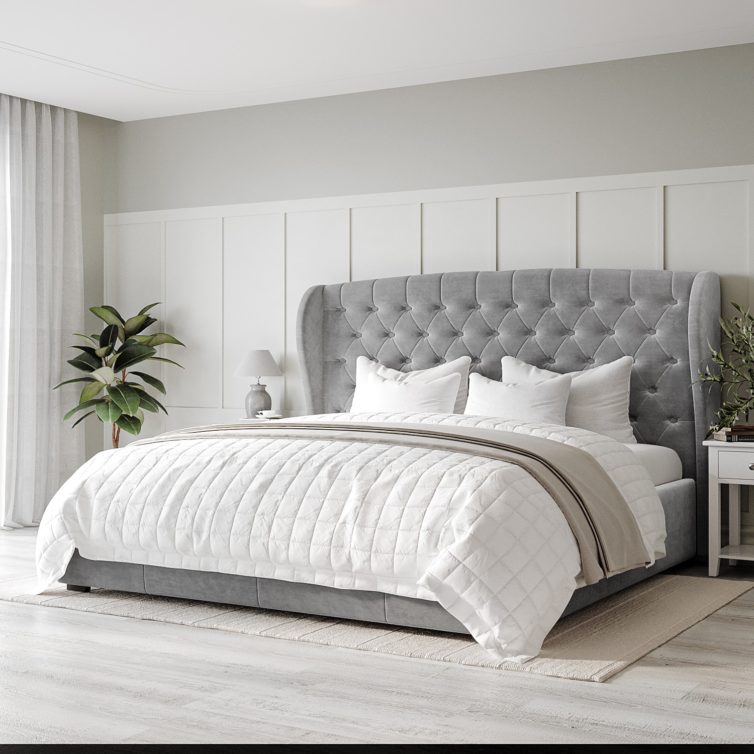 Grey Velvet Super King Ottoman Bed with Winged Headboard Maddox Furniture123